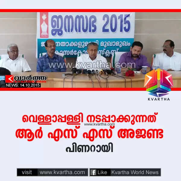 കാസര്കോട്: (www.kvartha.com 14/10/2015) കേരളത്തില് ആര് എസ് എസിനെ ശക്തിപ്പെടുത്താനുള്ള ശ്രമമാണ് എസ് എന് ഡി പി യോഗം ജനറല് സെക്രട്ടറി വെള്ളാപ്പള്ളി നടേശന് ശ്രമിക്കുന്നതെന്ന് സി പി എം മുന് സംസ്ഥാനസെക്രട്ടറിയും പോളിറ്റ് ബ്യൂറോ അംഗവുമായ പിണറായി വിജയന് ആരോപിച്ചു. ബുധനാഴ്ച രാവിലെ കാസര്കോട് പ്രസ് ക്ലബ്ബിന്റെ 'ജനസഭ-2015' പരിപാടിയില് പങ്കെടുത്ത് സംസാരിക്കുകയായിരുന്നു പിണറായി.