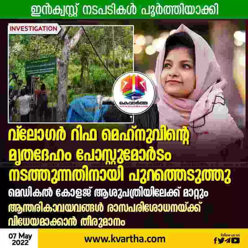 Keywords:  News,Kerala,State,Kozhikode,Trending,Death,Case,Husband,Police,Complaint, Vlogger Rifa Mehnu dead body transferred to medical college for autopsy