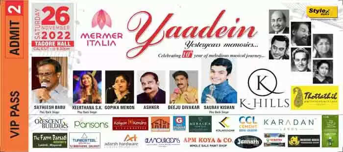 പിന്നണി ഗായകന് സതീഷ് ബാബുവും മുഹമ്മദ് റഫി ഫെയിം സൗരവ് കിഷനും യാദേന് ഷോ നയിക്കും. ഗോപിക മേനോന്, എസ് കെ കീര്ത്തന, ദീജു ദിവാകര്, അശ്കര് എന്നിവരും ഗാനങ്ങള് ആലപിക്കും . മുഹമ്മദ് റഫി, കിഷോര് കുമാര്, മുകേഷ്, ലതാ മങ്കേഷ്കര്, യേശുദാസ് എന്നിവരുടെ സൂപര് ഹിറ്റ് ബോളിവുഡ് ഗാനങ്ങളാണ് അവതരിപ്പിക്കുക. പ്രവേശനം പാസ് മൂലം നിയന്ത്രിക്കുമെന്ന് അണിയറക്കാര് അറിയിച്ചു.