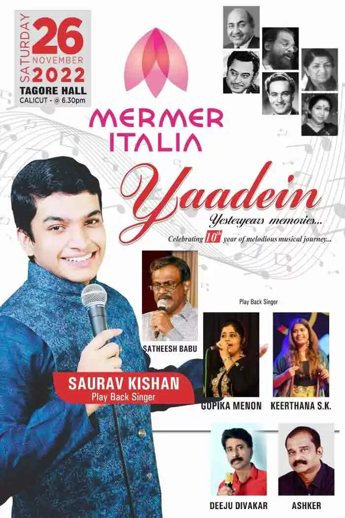 കോഴിക്കോട് : (www.kvartha.com) പഴയ കാല സൂപര് ഹിറ്റ് ഹിന്ദി ഗാനങ്ങള് കോര്ത്തിണക്കി ഒരുക്കുന്ന സംഗീത വിരുന്ന് യാദേന് 10 വര്ഷം പിന്നിടുന്നു. സംഗീത യാത്രയുടെ 10-ാം വാര്ഷികം മെര്മര് ഇറ്റാലിയ യാദേന് മ്യൂസിക് ഷോ നവംബര് 26 ന് ശനിയാഴ്ച വൈകുന്നേരം 6.30 ന് ടാഗോര് ഹാളില് നടക്കും.