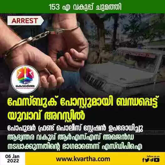 ആർ എസ് എസ് കലാപത്തിന് ആഹ്വാനം ചെയ്തതായുള്ള വാർത്തയുമായി ബന്ധപ്പെട്ടായിരുന്നു ഫേസ്ബുക് പോസ്റ്റ്. മതസ്പർധ പരത്തുന്ന തരത്തിൽ ഫേസ്ബുക് പോസ്റ്റിട്ടെന്ന കുറ്റം ചുമത്തിയാണ് പൊലീസ് നടപടി. ഐപിസി 153 എ വകുപ്പാണ് ചുമത്തിയത്.