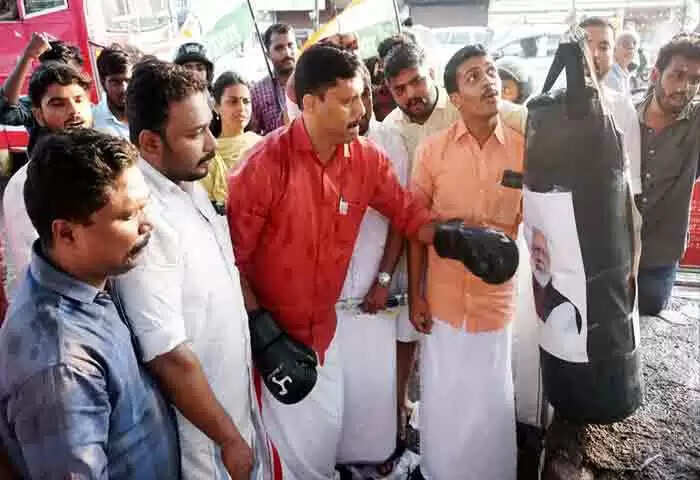കണ്ണൂര്‍: (www.kvartha.com) രാജ്യ തലസ്ഥാനത്ത് ഗുസ്തി താരങ്ങള്‍ നടത്തി വരുന്ന സമരത്തിന് നേരെ കേന്ദ്ര സര്‍കാര്‍ നടത്തിയ കിരാത നടപടിയില്‍ പ്രതിഷേധിച്ച് ഇന്‍ഡ്യന്‍ യൂത് കോണ്‍ഗ്രസ് കണ്ണൂര്‍ ജില്ലാ കമിറ്റിയുടെ ആഭിമുഖ്യത്തില്‍ നരേന്ദ്ര മോദിയുടെ മുഖത്ത് പഞ്ച് ചെയ്ത് കൊണ്ട് യൂത് കോണ്‍ഗ്രസ് സംസ്ഥാന വൈസ് പ്രസിഡന്റ് റിജില്‍ മാക്കുറ്റി ഉദ്ഘാടനം ചെയ്തു.