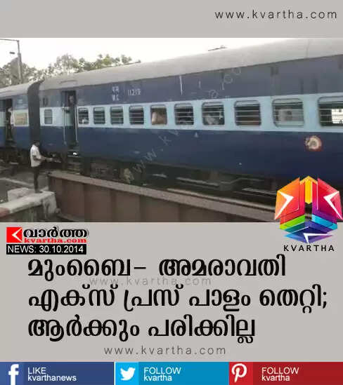 മുംബൈ: (www.kvartha.com 30.10.2014) മുംബൈ- അമരാവതി എക്സ് പ്രസ് പാളം തെറ്റി. മുംബൈയില് നിന്നും 54 കിലോമീറ്റര് അകലെയുള്ള കല്യാണ് റെയില്വെ സ്റ്റേഷനിലാണ് അപകടം. വ്യാഴാഴ്ച രാവിലെ 4:50 മണിയോടെയാണ് സംഭവം. അപകടത്തില് ആര്ക്കും പരിക്കില്ല.