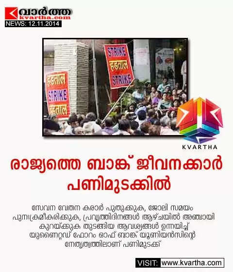 ഡെല്ഹി: (www.kvartha.com 12.11.2014) വിവിധ ആവശ്യങ്ങള് ഉന്നയിച്ച് രാജ്യത്തെ ബാങ്ക് ജീവനക്കാരും ഉദ്യോഗസ്ഥരും ബുധനാഴ്ച പണിമുടക്കുന്നു. സേവന വേതന കരാര് പുതുക്കുക, ജോലി സമയം പുനഃക്രമീകരിക്കുക, പ്രവൃത്തിദിനങ്ങള് ആഴ്ചയില് അഞ്ചായി കുറയ്ക്കുക തുടങ്ങിയ ആവശ്യങ്ങള് ഉന്നയിച്ച് യുണൈറ്റഡ് ഫോറം ഓഫ് ബാങ്ക് യൂണിയന്സിന്റെ നേതൃത്വത്തിലാണ് പണിമുടക്ക് .പൊതുമേഖല സ്വകാര്യ വിദേശ ഗ്രാമീണ ബാങ്കുകളിലെ ജീവനക്കാരും ഉദ്യോഗസ്ഥരും ഉള്പെടെ രാജ്യത്തെ 10 ലക്ഷത്തോളം ജീവനക്കാര് പണിമുടക്കില് പങ്കാളികളാകുന്നു.