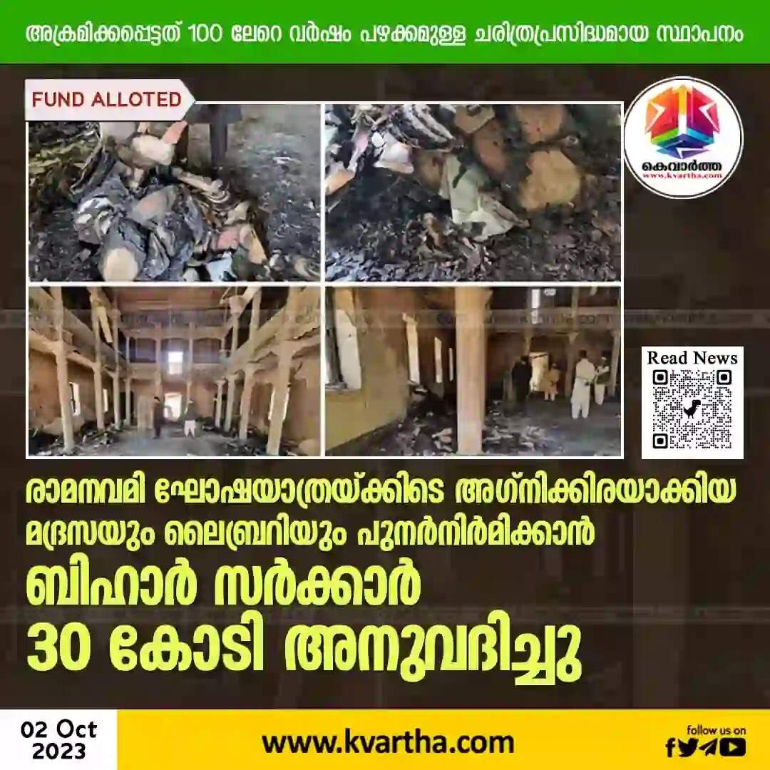 Govt Fund | രാമനവമി ഘോഷയാത്രയ്ക്കിടെ അഗ്നിക്കിരയാക്കിയ മദ്രസയും ലൈബ്രറിയും പുനർനിർമിക്കാൻ ബിഹാർ സർക്കാർ 30 കോടി അനുവദിച്ചു; അക്രമിക്കപ്പെട്ടത് 100 ലേറെ വർഷം പഴക്കമുള്ള ചരിത്രപ്രസിദ്ധമായ സ്ഥാപനം