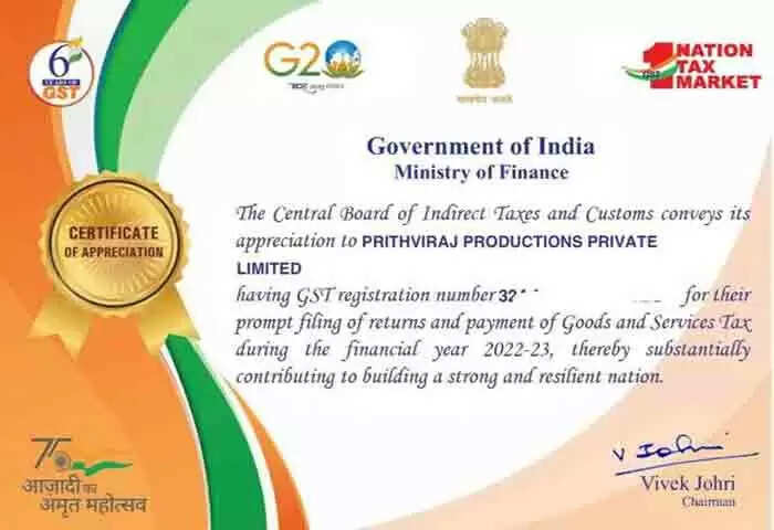 Prithviraj Productions | കൃത്യമായി നികുതി അടച്ചതിന് പൃഥ്വിരാജ് പ്രൊഡക്ഷന്സിന് കേന്ദ്രസര്കാരിന്റെ അംഗീകാരം