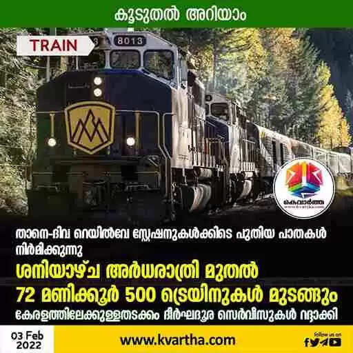 താനെ-ദിവ റെയില്‍വേ സ്റ്റേഷനുകള്‍ക്കിടെ പുതിയ പാതകള്‍ നിര്‍മിക്കുന്നു; ശനിയാഴ്ച അര്‍ധരാത്രി മുതല്‍ 72 മണിക്കൂര്‍ 500 ട്രെയിനുകള്‍ മുടങ്ങും, കേരളത്തിലേക്കുള്ളതടക്കം ദീര്‍ഘദൂര സെര്‍വീസുകള്‍ റദ്ദാക്കി, കൂടുതല്‍ അറിയാം