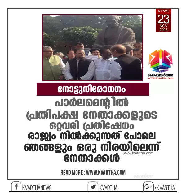 നോട്ടുനിരോധനം: പാര്ലമെന്റില് പ്രതിപക്ഷ നേതാക്കളുടെ ഒറ്റവരി പ്രതിഷേധം, രാജ്യം നില്ക്കുന്നത് പോലെ ഞങ്ങളും ഒരു നിരയിലെന്ന് നേതാക്കള്