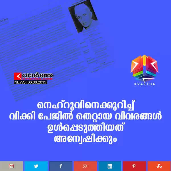നെഹ്റുവിനെക്കുറിച്ച് വിക്കി പേജില് തെറ്റായ വിവരങ്ങള് ഉള്പ്പെടുത്തിയത് അന്വേഷിക്കും