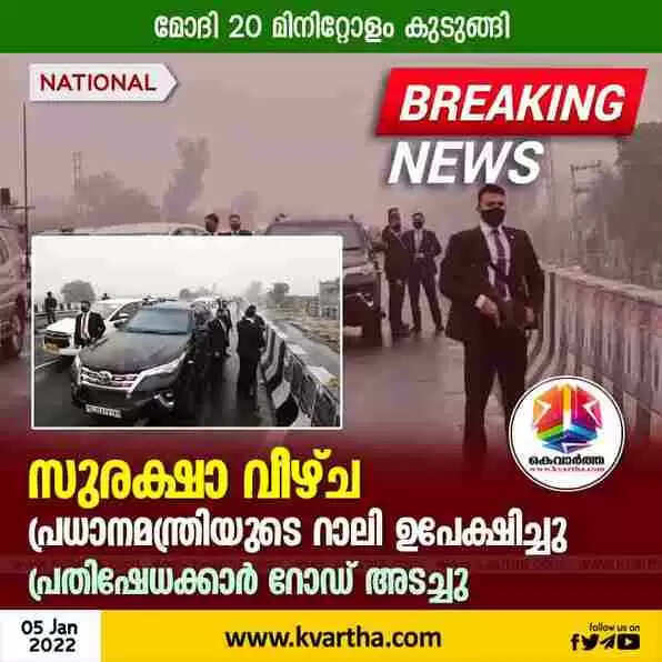 സുരക്ഷാ വീഴ്ച: പ്രധാനമന്ത്രിയുടെ റാലി ഉപേക്ഷിച്ചു, പ്രതിഷേധക്കാര് റോഡ് അടച്ചു, മോദി 20 മിനിറ്റോളം കുടുങ്ങി