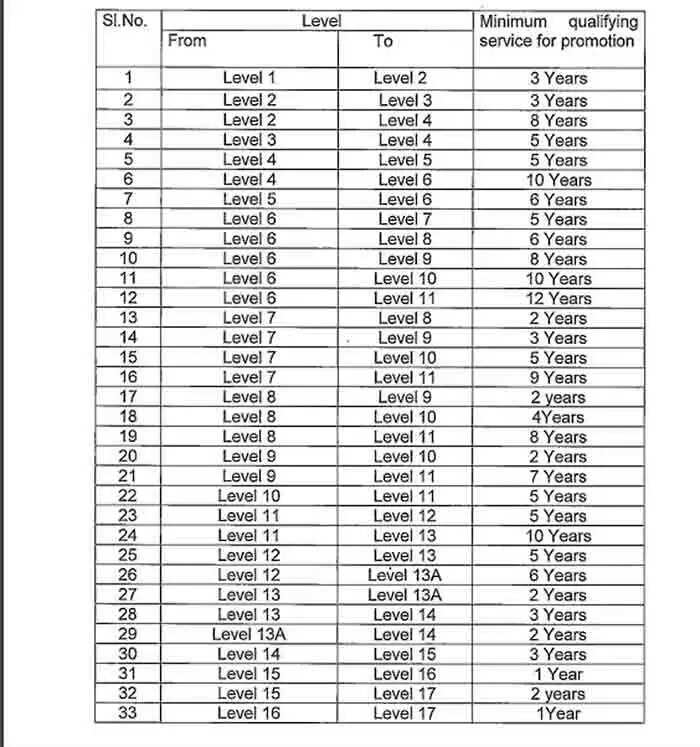 ഇതിനായി, എല്ലാ മന്ത്രാലയങ്ങളോടും / വകുപ്പുകളോടും കൃത്യമായ നടപടിക്രമങ്ങള് പാലിച്ച് റിക്രൂട്മെന്റ് ചട്ടങ്ങളില് ആവശ്യമായ മാറ്റങ്ങള് വരുത്താനും അഭ്യര്ഥിച്ചു. ഭേദഗതി ചെയ്ത ചട്ടങ്ങള് പ്രകാരം, ലെവല് 1, ലെവല് 2 എന്നിവയ്ക്ക് മൂന്ന് വര്ഷത്തെ സര്വീസ് ആവശ്യമാണ്. അതേ സമയം, ലെവല് 6 മുതല് ലെവല് 11 വരെ 12 വര്ഷത്തെ സേവനം ആവശ്യമാണ്. എന്നിരുന്നാലും, ലെവല് 7, ലെവല് 8 എന്നിവയ്ക്ക് രണ്ട് വര്ഷത്തെ സര്വീസ് മാത്രമേ ആവശ്യമുള്ളൂ.