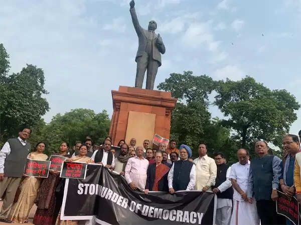 അതിനിടെ, ഭരണഘടനാ ദിനാചരണത്തിന്റെ ഭാഗമായി ചേരുന്ന പാര്ലമെന്റിന്റെ സംയുക്ത സമ്മേളനം കോണ്ഗ്രസ് അടക്കമുള്ള പ്രതിപക്ഷ കക്ഷികള് ബഹിഷ്കരിച്ചു. രാഷ്ട്രപതിയുടെ പ്രസംഗം അടക്കം ബഹിഷ്കരിച്ച പ്രതിപക്ഷ കക്ഷികള് പാര്ലമെന്റ് വളപ്പിലെ അംബേദ്കര് പ്രതിമയ്ക്കു മുന്നില് ഭരണഘടന വായിച്ചു.