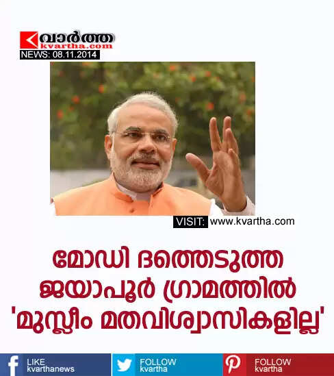 വാരണാസി: (www.kvartha.com 08.11.2014) സന്സദ് ആദര്ശ് ഗ്രാമയോജന പദ്ധതിയുടെ ഭാഗമായി പ്രധാനമന്ത്രി നരേന്ദ്ര മോഡി കഴിഞ്ഞദിവസം ദത്തെടുത്ത ജയാപൂര് ഗ്രാമത്തില് ഒരു മുസ്ലീം മതവിശ്വാസി പോലുമില്ലെന്ന് ആര് എസ് എസ് ജില്ലാ സഹ ജനറല് സെക്രട്ടറി അരവിന്ദ് സിംഗ് .