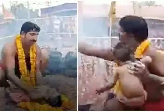 വൈറലായ വീഡിയോയില്, വാരണാസിയില് നിന്നുള്ള പൂജാരി ഒരു പാത്രത്തില് നിന്ന് ചൂട് പാല്നുര കുഞ്ഞിന്റെ മുഖത്തും നെഞ്ചിലും പുരട്ടുന്നത് കാണാം. കുഞ്ഞ് വേദന കൊണ്ട് കരയുന്നതും ആയിരക്കണക്കിന് ആളുകള് അവരെ നോക്കി പ്രാര്ഥിക്കുകയും ചെയ്യുന്നത് വീഡിയോയില് വ്യക്തമാണ്.