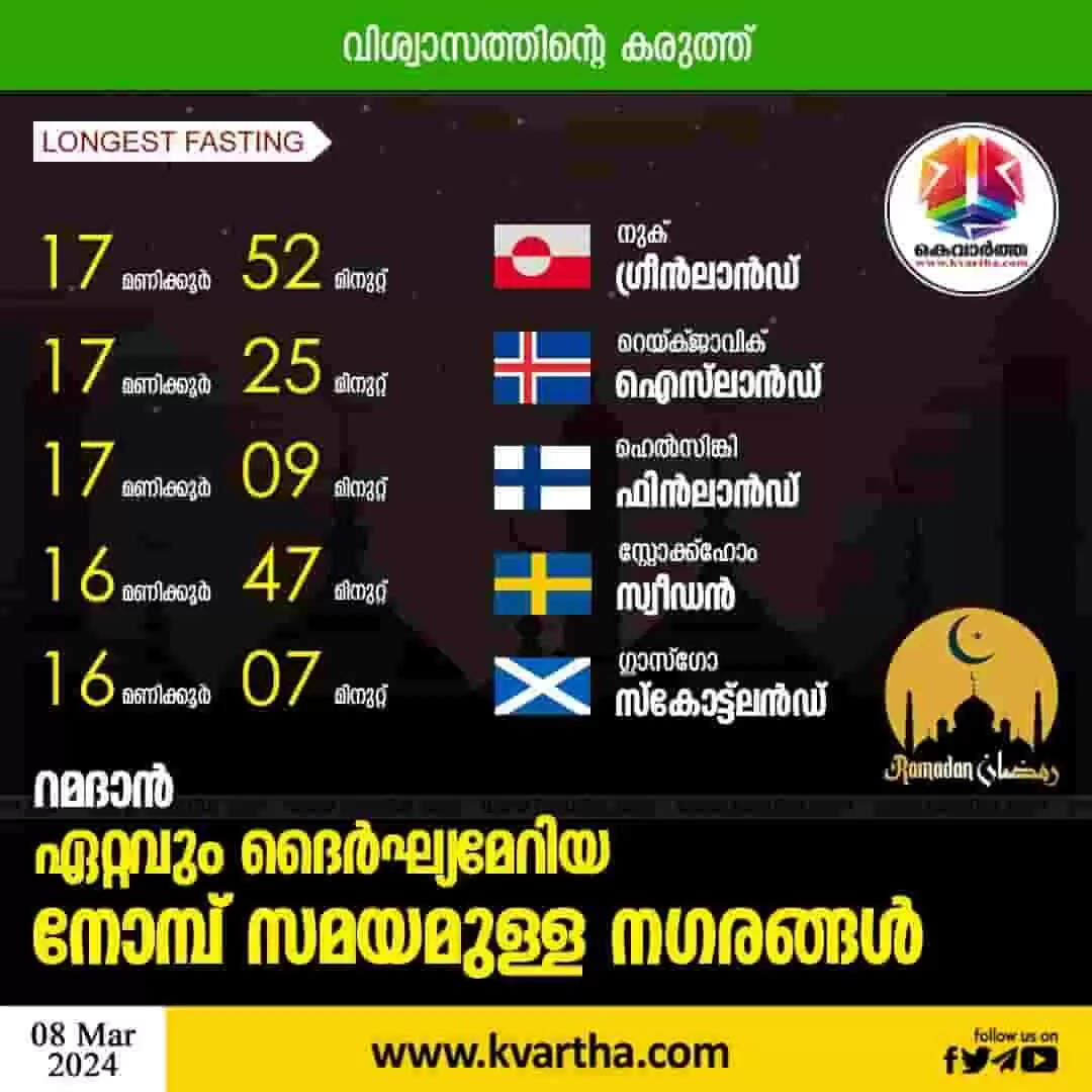 ന്യൂഡെൽഹി: (KVARTHA) മുസ്ലിംകളുടെ വിശുദ്ധ മാസമായ റമദാൻ ആരംഭിക്കുകയാണ്. കൊടും ചൂടിലും ദൈര്ഘ്യമേറിയ പകലിലുമുള്ള വ്രതാനുഷ്ഠാനത്തെ വിശ്വാസത്തിന്റെ കരുത്തില് അതിജീവിച്ചാണ് വിശ്വാസികൾ പൂര്ത്തിയാക്കുന്നത്. ലോകത്ത് ഓരോ ഇടത്തും റമദാൻ വ്രതത്തിന്റെ സമയം വ്യത്യസ്തമായിരിക്കും. ഇത്തവണ റമദാൻ വ്രതം 12 മുതൽ 18 മണിക്കൂർ വരെ നീണ്ടു നിൽക്കുന്നതായിരിക്കും. ലോകത്ത് ഒരു വ്യക്തി എവിടെയാണോ അതിന് അനിസരിച്ച് വേണം നോമ്പ് അനുഷ്ഠിക്കാൻ.