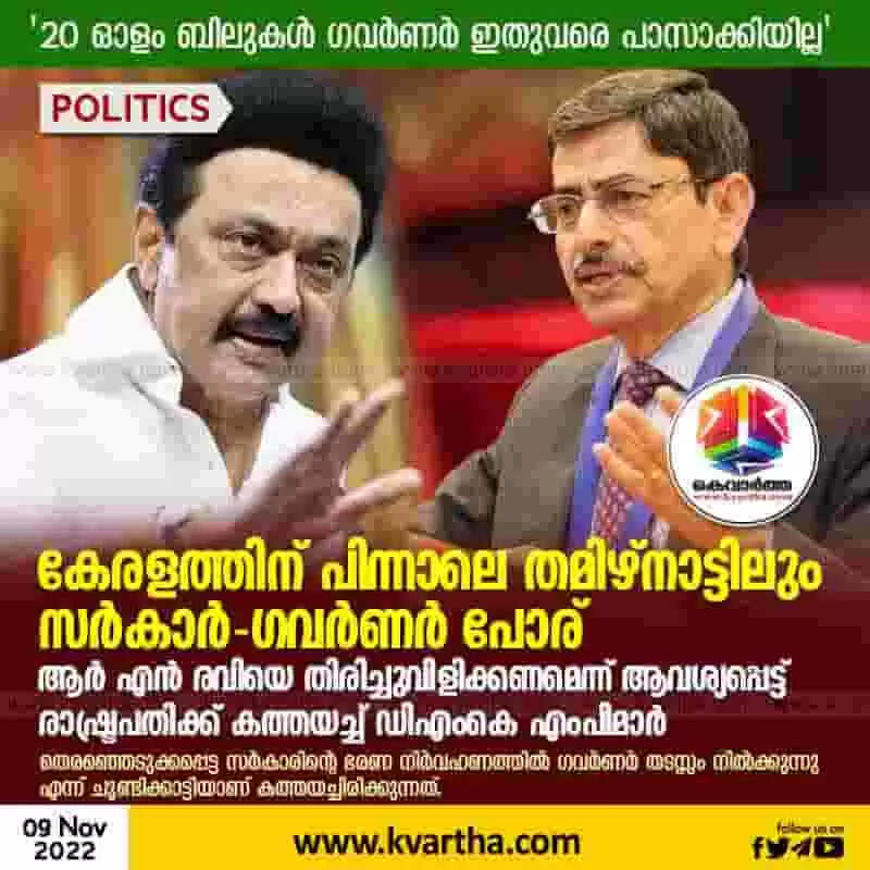 Governor | കേരളത്തിന് പിന്നാലെ തമിഴ് നാട്ടിലും സര്കാര് ഗവര്ണര് പോര്; ആര് എന് രവിയെ തിരിച്ചുവിളിക്കണമെന്ന് ആവശ്യപ്പെട്ട് രാഷ്ട്രപതിക്ക് കത്തയച്ച് ഡിഎംകെ എംപിമാര്