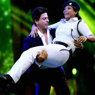 SUMMARY: Kolkata: Shah Rukh Khan swept a woman constable in uniform off her feet, literally, and danced with her around the stage as Chief Minister Mamata Banerjee looked on.