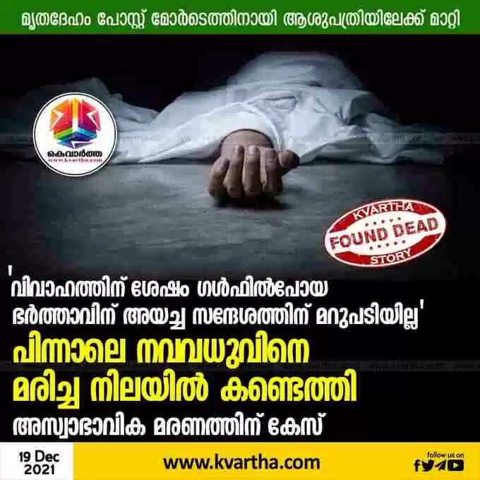 'വിവാഹത്തിന് ശേഷം ഗള്ഫില്പോയ ഭര്ത്താവിന് അയച്ച സന്ദേശത്തിന് മറുപടിയില്ല'; പിന്നാലെ നവവധുവിനെ മരിച്ച നിലയില് കണ്ടെത്തി, അസ്വാഭാവിക മരണത്തിന് കേസ്