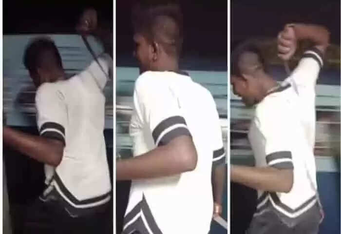 വീഡിയോയില്‍ എതിര്‍ ദിശയിലൂടെ സാമാന്യം വേഗത്തില്‍ പോകുന്ന ട്രെയിന്റെ വാതില്‍പ്പടിയില്‍ ഇരിക്കുന്നവരെയാണ് ഇയാള്‍ ബെല്‍റ്റ് ഉപയോഗിച്ച് അടിക്കുന്നത്. ചില സമയങ്ങളില്‍ അടി മറ്റുള്ളവര്‍ക്ക് കൊള്ളുന്നതിനായി ഇയാള്‍ അപകടകരമായ രീതിയില്‍ കുനിയുന്നതും വീഡിയോയില്‍ കാണാം.