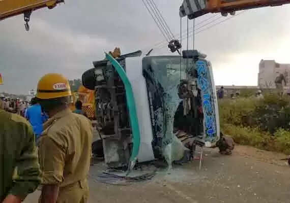 തിരുപ്പതിയിൽ നിന്നും ബാംഗ്ലൂരിലേയ്ക്ക് വരികയായിരുന്ന രാജേഷ് ട്രാവൽസ് എന്ന സ്വകാര്യ ബസാണ് അപകടത്തിൽ പെട്ടത്. പരിക്കേറ്റ 19 പേരിൽ രണ്ട് പേരുടെ നില അതീവ ഗുരുതരമാണ്. പരിക്കേറ്റവരെ എം.വിജെ ആശുപത്രിയിൽ പ്രവേശിപ്പിച്ചു.