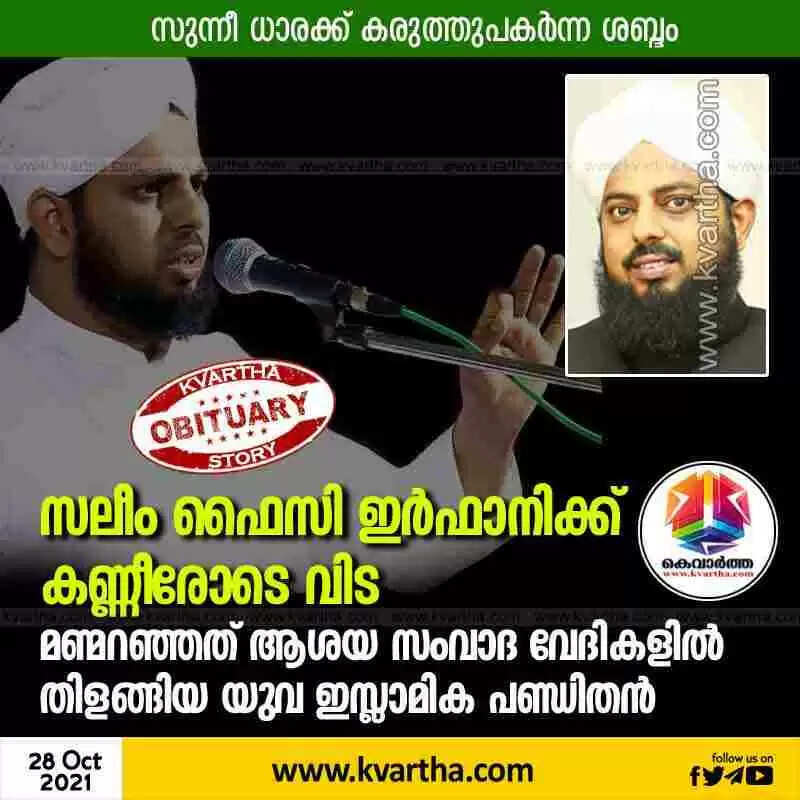 കണ്ണൂർ: (www.kvartha.com 28.10.2021) യുവ ഇസ്ലാമിക പണ്ഡിതൻ സലിം സലീം ഫൈസി ഇർഫാനിക്ക് കണ്ണീരോടെ വിട. ആശയ സംവാദ വേദികളിൽ നിറസാന്നിധ്യമായിരുന്നു അദ്ദേഹം സുന്നീ പക്ഷത്തെ ഉറച്ച ശബ്ദമായിരുന്നു. മികച്ചൊരു പ്രഭാഷകൻ കൂടിയായിരുന്നു അദ്ദേഹം. ചുരുങ്ങിയ കാലം കൊണ്ട് തന്നെ വൈജ്ഞാനിക രംഗത്ത് അത്ഭുതകരമായ നേട്ടം കൈവരിക്കാൻ അദ്ദേഹത്തിനായിരുന്നു.