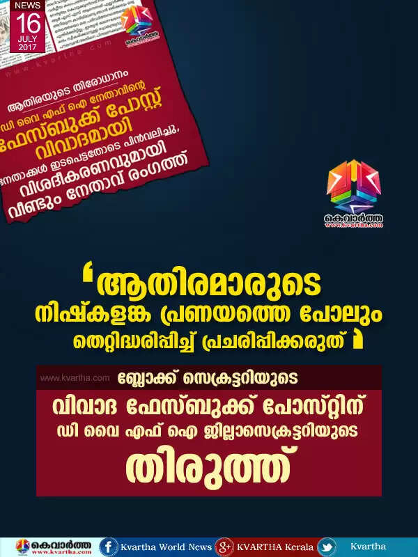 ആതിരമാരുടെ നിഷ്‌കളങ്ക പ്രണയത്തെ പോലും തെറ്റിദ്ധരിപ്പിച്ച് പ്രചരിപ്പിക്കരുത്; ബ്ലോക്ക് സെക്രട്ടറിയുടെ വിവാദ ഫേസ്ബുക്ക് പോസ്റ്റിന് ഡി വൈ എഫ് ഐ ജില്ലാസെക്രട്ടറിയുടെ തിരുത്ത്