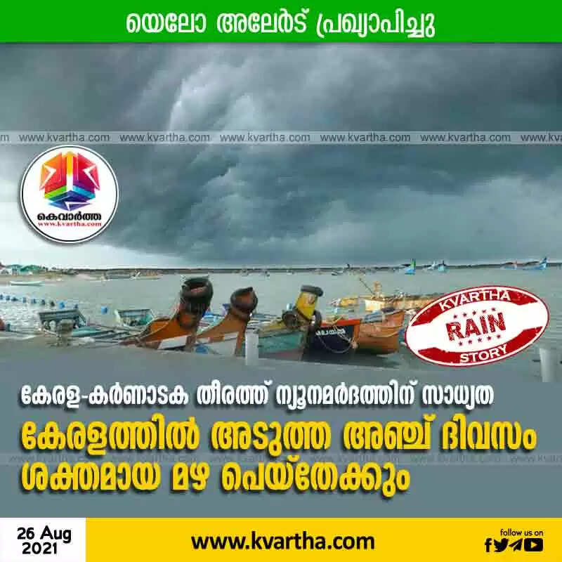കേരള-കർണാടക തീരത്ത് ന്യൂനമർദത്തിന് സാധ്യത; കേരളത്തിൽ അടുത്ത അഞ്ച് ദിവസം ശക്തമായ മഴ പെയ്തേക്കും