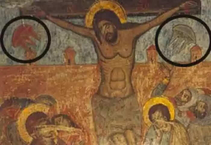 അതേസമയം, ഇത് കാവല് മാലാഖമാരാവാമെന്നാണ് ചില ചരിത്രകാരന്മാര് പറയുന്നത്. എന്നാല്, ചിറകില്ലാത്ത മാലാഖ എന്ത് മാലാഖയാണെന്ന് സൈറ്റ് ചോദിക്കുന്നു. ജോര്ജിയയിലെ സ്വെറ്റിറ്റ്സ്ഖോവേലി കതീഡ്രലിലെ ചുവരിലാണ് ഈ ചിത്രമുള്ളത്. യേശുക്രിസ്തുവിനെ കുരിശില് തറച്ച പെയിന്റിംഗാണ് ഇത്.