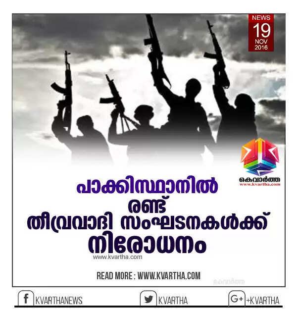 ഇസ്ലാമാബാദ്: (www.kvartha.com 19.11.2016) പാക്കിസ്ഥാനില് രണ്ട് തീവ്രവാദി സംഘടനകള്ക്ക് കൂടി നിരോധനം ഏര്പ്പെടുത്തി. ജമാ അത്തുല് അഹ് രാര്, ലഷ്കര് ഇ ജാങ് വി അല് അലാമി എന്നീ സംഘടനകള്ക്കാണ് വിലക്കേര്പ്പെടുത്തിയിരിക്കുന്നത്.