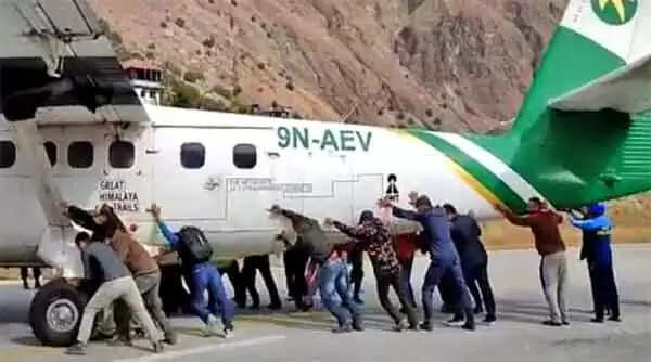 നേപാളിലെ ബജൂര വിമാനത്താവളത്തിലാണ് സംഭവം. വിമാനത്തിന്റെ ടയര് കേടായതോടെ യാത്രക്കാര് ചേര്ന്ന് ഒന്നിച്ച് തള്ളിമാറ്റി വിമാനം റണ്വേയില്നിന്ന് മാറ്റുകയാണ്. മറ്റു വിമാനങ്ങള്ക്ക് ഇറങ്ങാനോ പറക്കാനോ കഴിയാത്ത തരത്തില് വിമാനം റണ്വേയില് വഴിമുടക്കിയതോടെയാണ് അധികൃതരെ സഹായിക്കാനായി യാത്രക്കാര് ഒത്തുപിടിച്ചത്.