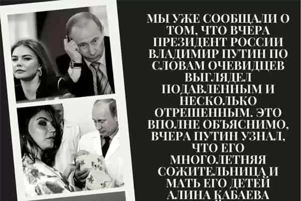 എന്നാല് വീണ്ടും അച്ഛനാകുന്നതില് റഷ്യന് പ്രസിഡന്റ് അതൃപ്തനാണെന്നും റിപോര്ട് ആരോപിക്കുന്നു. കബേവയുടെ ഗര്ഭധാരണത്തെക്കുറിച്ചുള്ള വാര്ത്തയില് പുടിന് അസ്വസ്ഥനാണെന്ന് ജനറല് എസ്വിആര് പറയുന്നു. തനിക്ക് ഇതിനകം മതിയായ കുട്ടികള് ഉണ്ടെന്നും, ഇതില് കൂടുതലും പെണ്മക്കളാണെന്നും അദ്ദേഹം പറയുന്നു. ഗര്ഭധാരണത്തില് അതൃപ്തി പ്രകടിപ്പിച്ച പുടിന്, കബീവയുടെ ആദ്യ പേരും മധ്യനാമവും ഉപയോഗിച്ച് അലീനയെ കുറ്റപ്പെടുത്തിയതായും അജ്ഞാത പോസ്റ്റര് അവകാശപ്പെട്ടു.