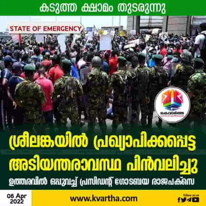 കൊളംബോ: (www.kvartha.com 06.04.2022) സാമ്പത്തിക പ്രതിസന്ധിക്കിടെ ജനം തെരുവിലിറങ്ങിയതോടെ ശ്രീലങ്കയില്‍ പ്രഖ്യാപിക്കപ്പെട്ട അടിയന്തരാവസ്ഥ പിന്‍വലിച്ചു. പ്രസിഡന്റ് ഗോടബയ രാജപക്‌സെ ഉത്തരവില്‍ ഒപ്പുവച്ചു. പ്രസിഡന്റ് ഗോടബയ രാജപക്‌സെയാണ് ഇത് സംബന്ധിച്ച ഉത്തരവ് ഇറക്കിയത്. ഈ മാസം ഒന്നുമുതലാണ് ശ്രീലങ്കയില്‍ അടിയന്തരാവസ്ഥ പ്രഖ്യാപിച്ചിരുന്നത്.