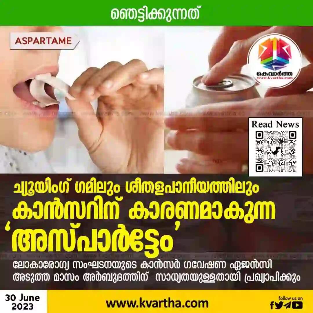 ജനീവ: (www.kvartha.com) ലോകത്തിലെ ഏറ്റവും സാധാരണമായ കൃത്രിമ മധുരപലഹാരമായ അസ്പാർട്ടേമിനെ കാൻസർ ഉണ്ടാക്കാൻ സാധ്യതയുള്ള ഉത്പന്നമായി ലോകാരോഗ്യ സംഘടന (WHO) അടുത്ത മാസം പ്രഖ്യാപിക്കാൻ പോകുകയാണ്. ശീതളപാനീയങ്ങൾ, എനർജി ഡ്രിങ്കുകൾ, ച്യൂയിംഗ് ഗം എന്നിങ്ങനെ പല വസ്തുക്കളിലും അസ്പാർട്ടേം കാണാം. പഞ്ചസാരയ്ക്ക് ബദലായാണ് അസ്പാർട്ടേം ഉപയോഗിക്കുന്നത്. ഇതിന് പൂജ്യം കലോറിയാണെന്നതും മറ്റ് പഞ്ചസാര ബദൽ ഉത്പന്നങ്ങളെ പോലെ കയ്പേറിയ രുചിയും ഇല്ലെന്നതും പ്രത്യേകതയാണ്.