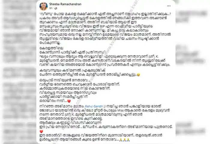 LS Result | 'വീണു പോയ മകളെ രക്ഷിക്കാൻ അച്ഛൻ, ബലിയാടായത് ഈ മനുഷ്യനും', തൃശൂരിലെ തോൽവിയിൽ കുറിപ്പുമായി ഷീബ രാമചന്ദ്രന്