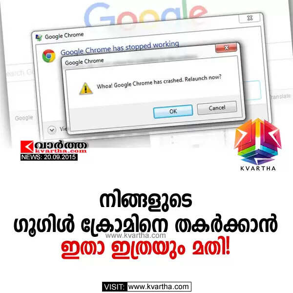 (www.kvartha.com 20.09.2015) ഇന്റര്നെറ്റ് ഉപയോഗിക്കുന്നവരില് പലരും ഇതിനായി ഉപയോഗിക്കുന്നത് ഗൂഗിള് ക്രോമാണ്. എന്നാല് ഈ ക്രോമിനെ തകര്ക്കാന് ഇത്രയും മതി. 16 ക്യാരക്ടറുകളുള്ള ' http://a/%%30%30 ' യു ആര് എല്ലാണ് ക്രോമിനെ തകര്ക്കുന്നത്. ഈ യു ആര് എല് സെര്ച്ച് ബാറില് വെച്ച് എന്റര് കീ ഒന്നു അമര്ത്തിയാല് മതി അപ്പോള് തന്നെ ക്രോം ക്രാഷ് ആകും.